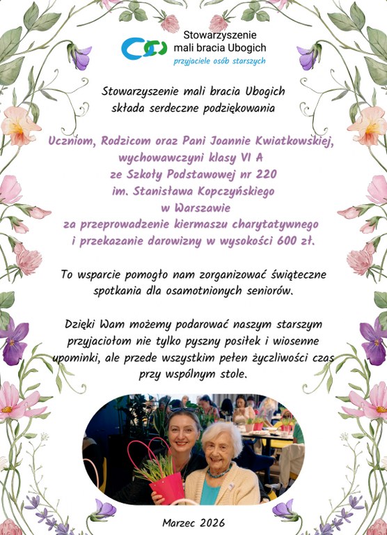 W naszej szkole 13 marca odbył się kiermasz charytatywny, z którego dochód został przekazany przez klasę 6a na wsparcie akcji „Wielkanocne Koszyczki”, organizowanej od wielu lat przez Stowarzyszenie Mali Bracia Ubogich.